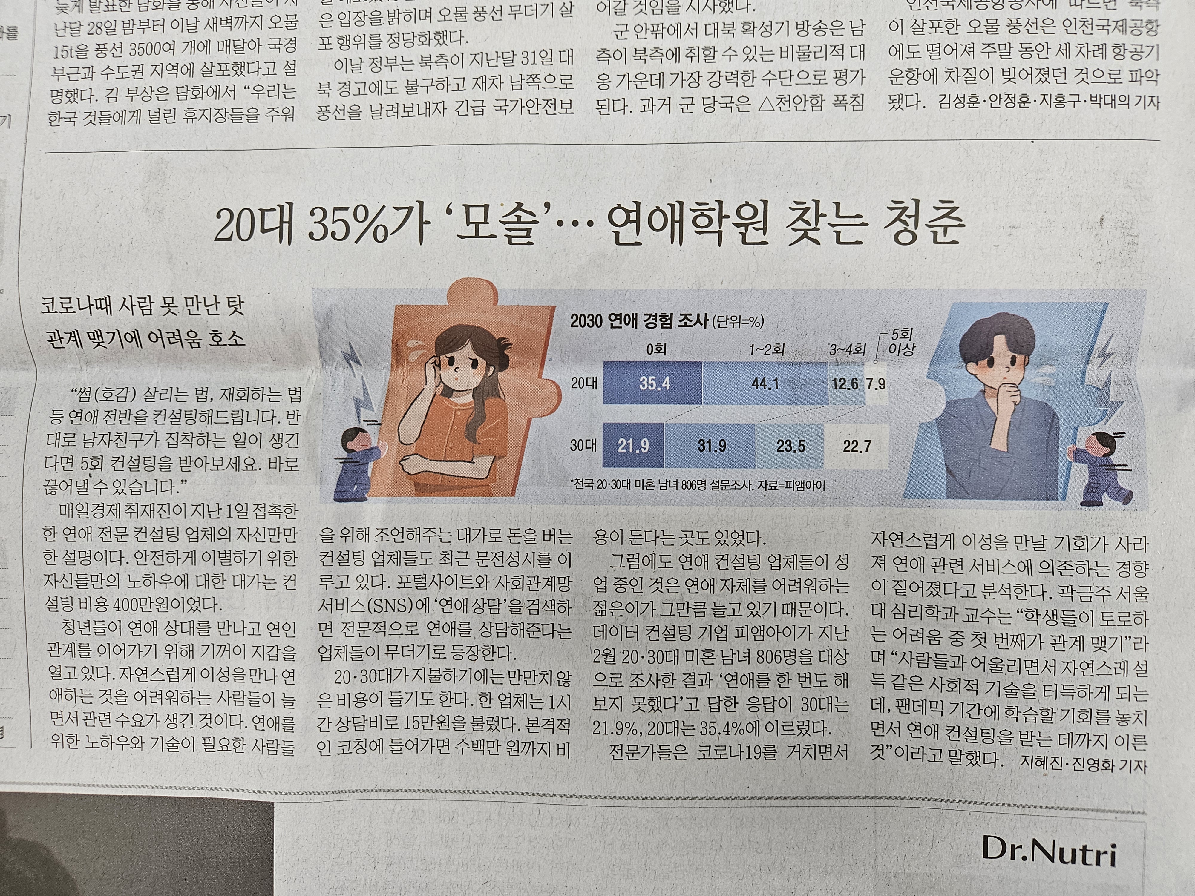현재 20대 35%가 모솔이고, 연애학원을 찾는 다는 내용이었다.