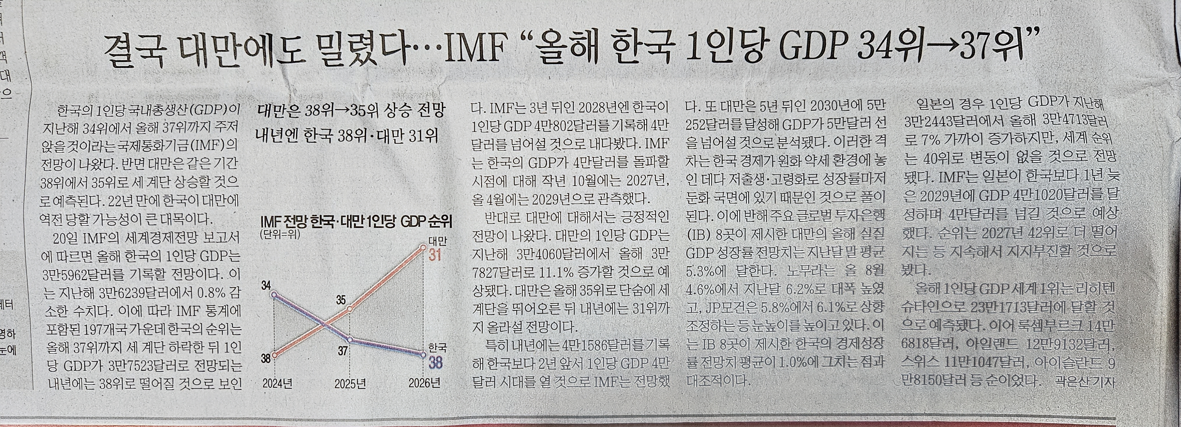🇰🇷 결국 대만에도 밀렸다… IMF “올해 한국 1인당 GDP 37위”