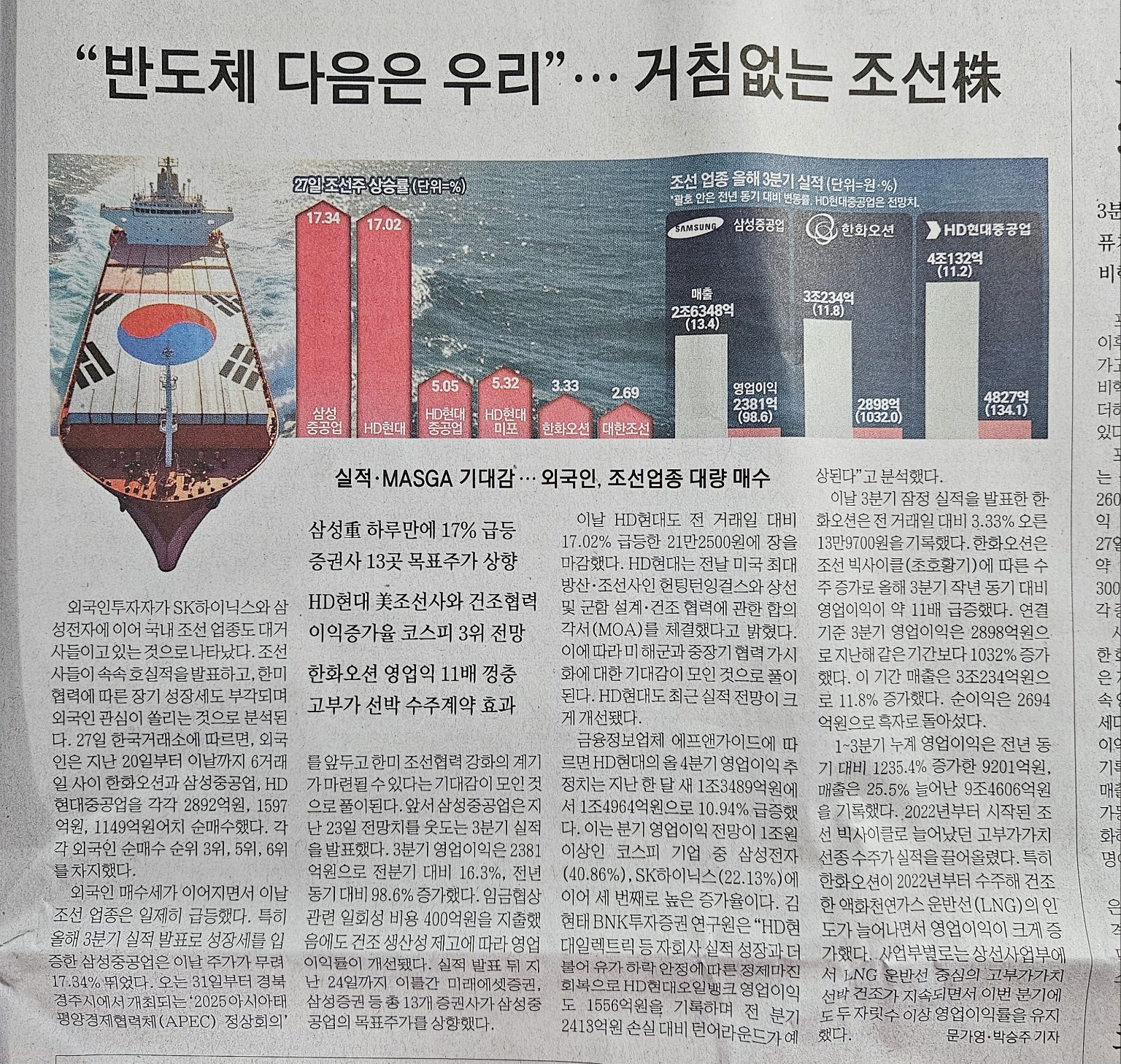 - 외국인 투자자들이 “반도체 다음은 한국 조선업”이라 보고 적극적으로 매수 중.