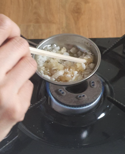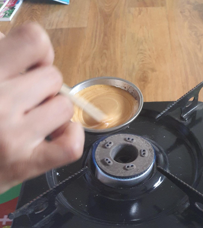 이제 달고나용 국자(?)에 설탕을 적당히 부어 불에 녹여 봅니다.
