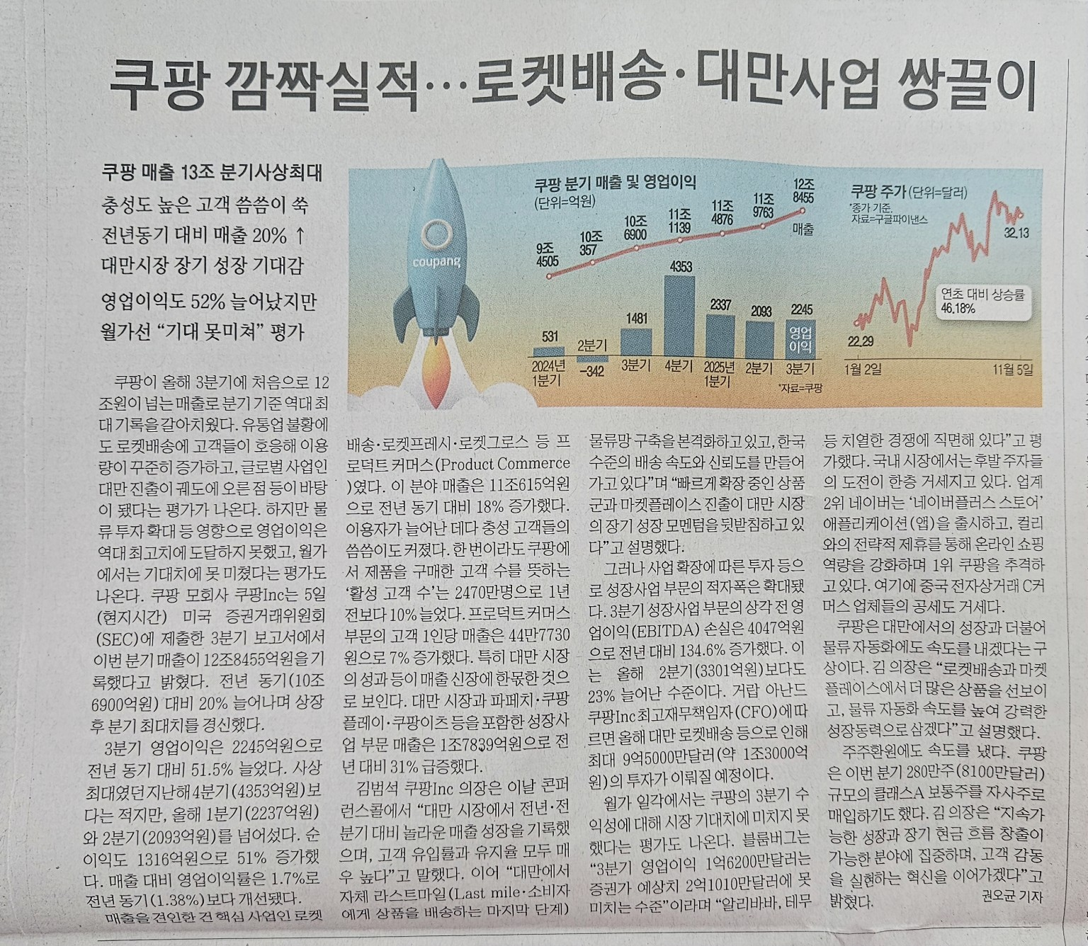 오늘은 기사 내용을 바탕으로 쿠팡 3분기 성적표를 정리해 봤습니다.