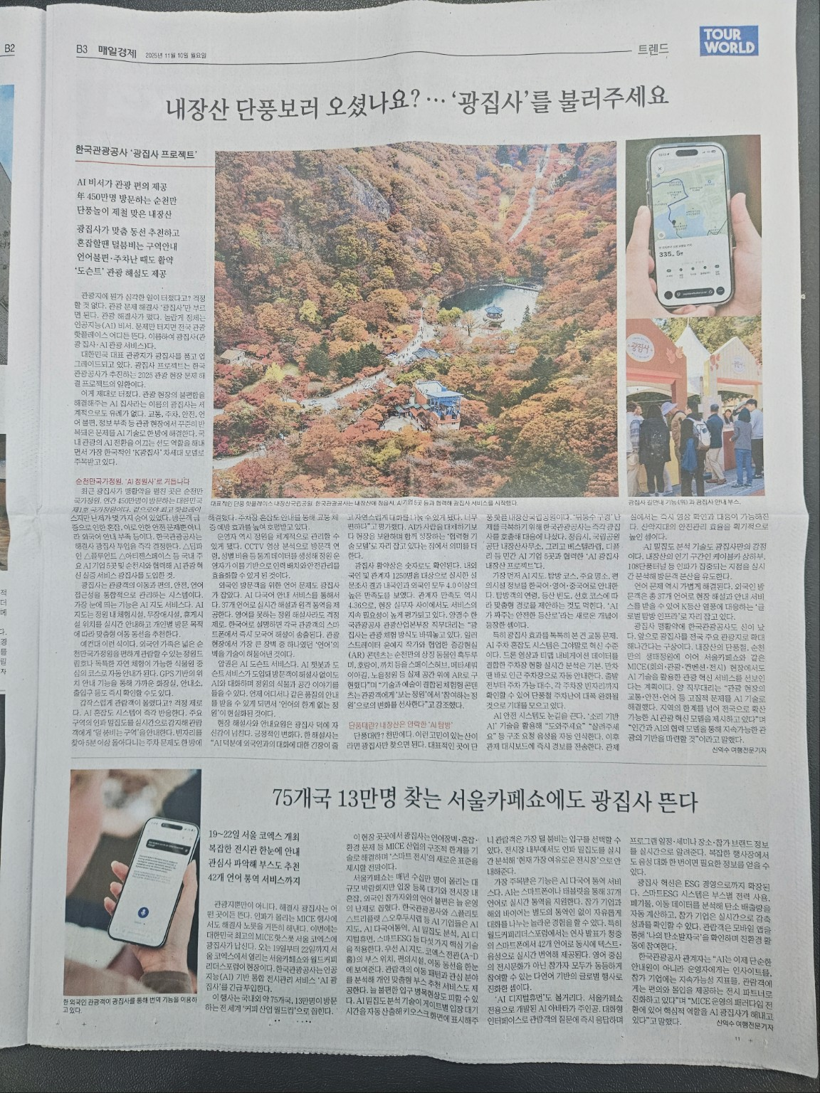 최근 신문 기사에서는 이런 불편을 줄이기 위해 한국관광공사가 선보인 AI 관광 비서 ‘광집사’ 프로젝트를 소개하고 있습니다. 이제 내장산 단풍 구경도 ‘AI 가이드’와 함께하는 시대가 온 거예요.