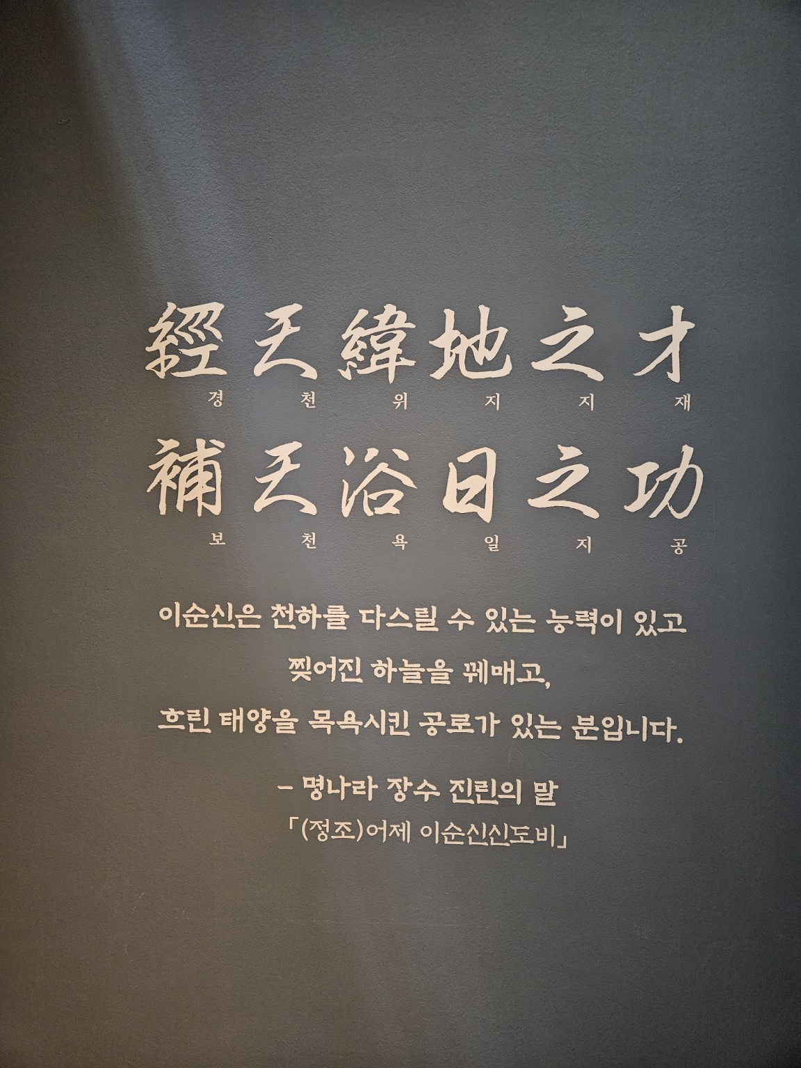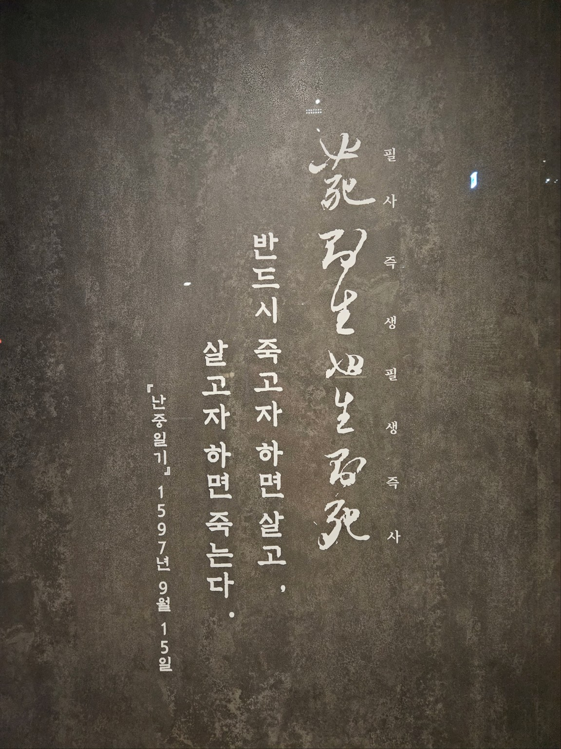 전시장 한쪽 벽에는 난중일기의 유명한 문장이 크게 적혀 있습니다.