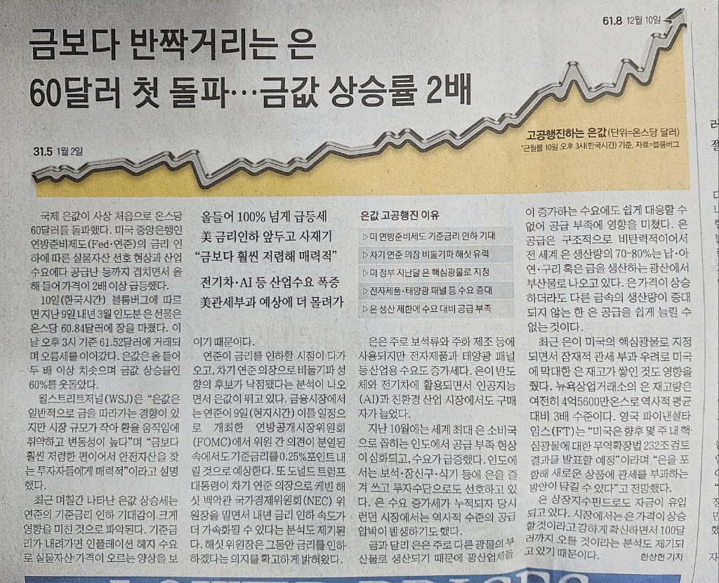 - 은값 60달러 돌파: 올해 상승률이 금의 2배인 100% 상회.