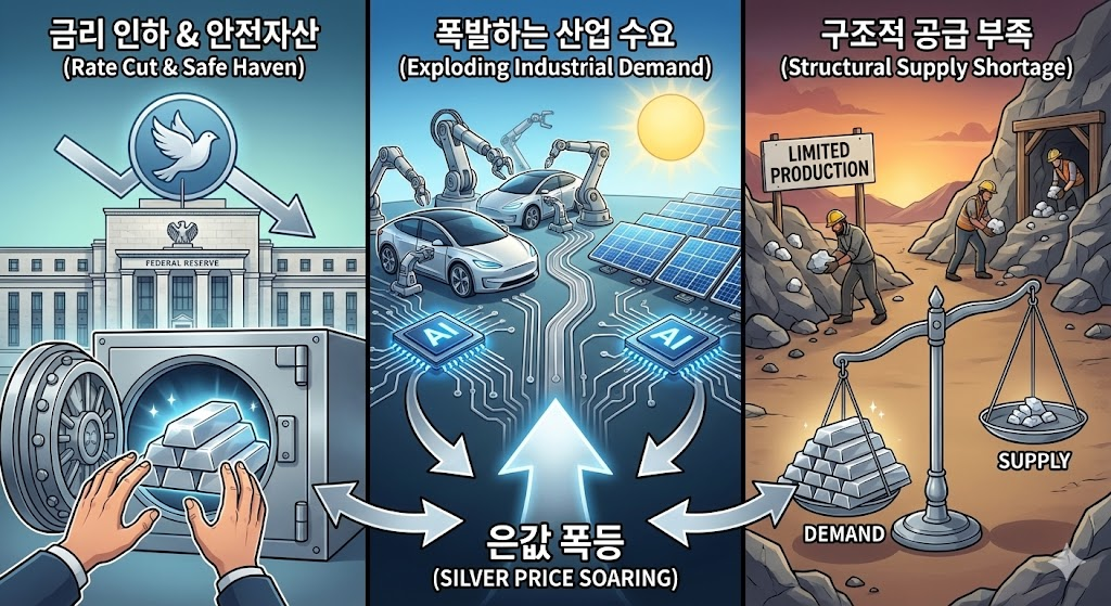 기사에서 분석한 은값 고공행진의 이유는 크게 세 가지로 요약됩니다.