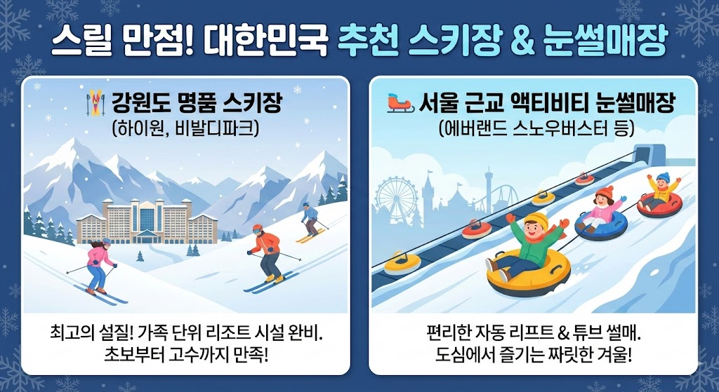 • 🛷 아이들의 천국, 눈썰매장: 굳이 멀리 가지 않아도 도심 근교나 테마파크(에버랜드, 서울랜드 등) 내 눈썰매장에서 온 가족이 즐길 수 있습니다.