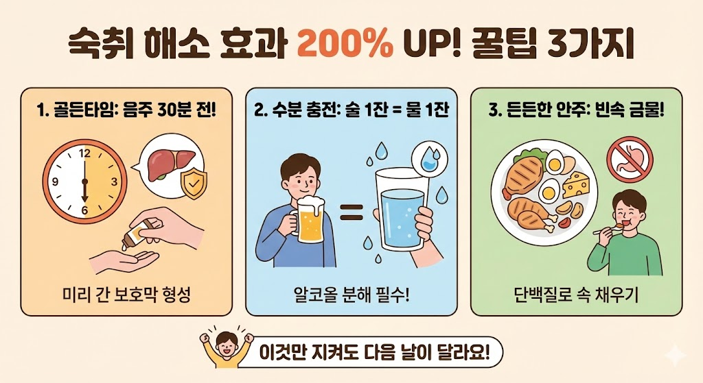 - 음주 30분 전: 간이 알코올 방어막을 형성할 시간을 주세요. (가장 중요!)