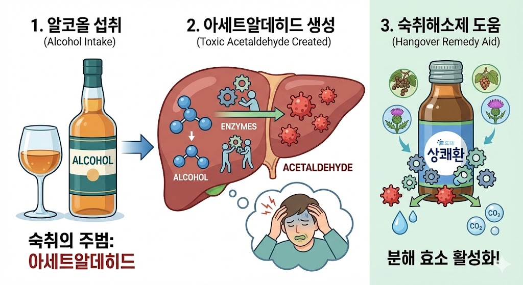 숙취의 주범은 알코올이 분해되면서 생기는 독성 물질인 **'아세트알데히드'**입니다.