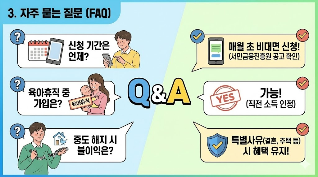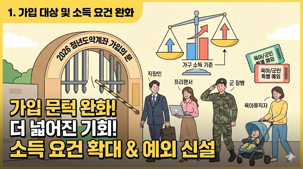 - 사각지대 해소 (육아휴직자 & 군 장병): 소득 증빙이 어려워 가입이 불가능했던 육아휴직자와 군 장병을 위한 예외 규정이 신설되었습니다. 소득 공백기 없이 자산을 쌓을 수 있도록 개선된 점이 가장 큰 특징입니다.
