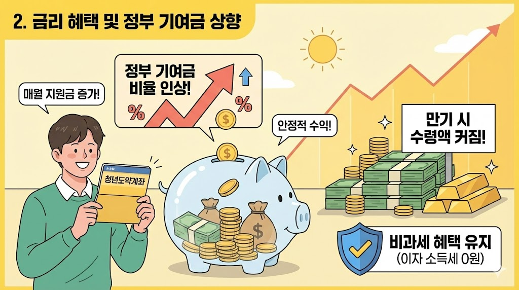 | 중도 해지 | 해지 시 혜택 소멸 | 특별 중도 해지 사유 확대 (결혼, 출산, 주택 구입 등) |