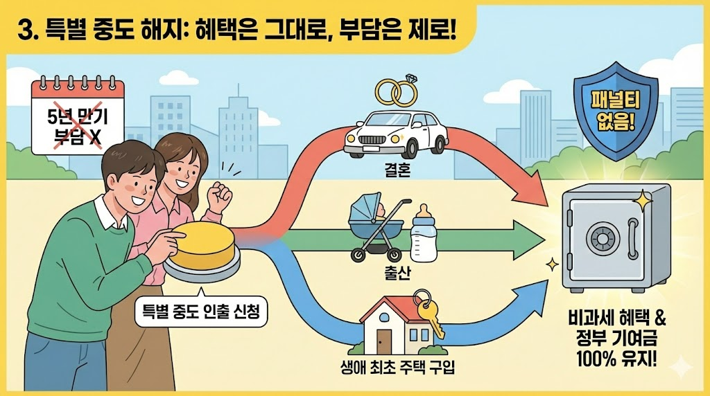 결혼, 출산, 생애 최초 주택 구입 등 목돈이 필요한 생애 주요 이벤트 발생 시, 중도에 해지하더라도 비과세 혜택과 정부 기여금을 100% 유지할 수 있는 조건이 강화되었습니다.