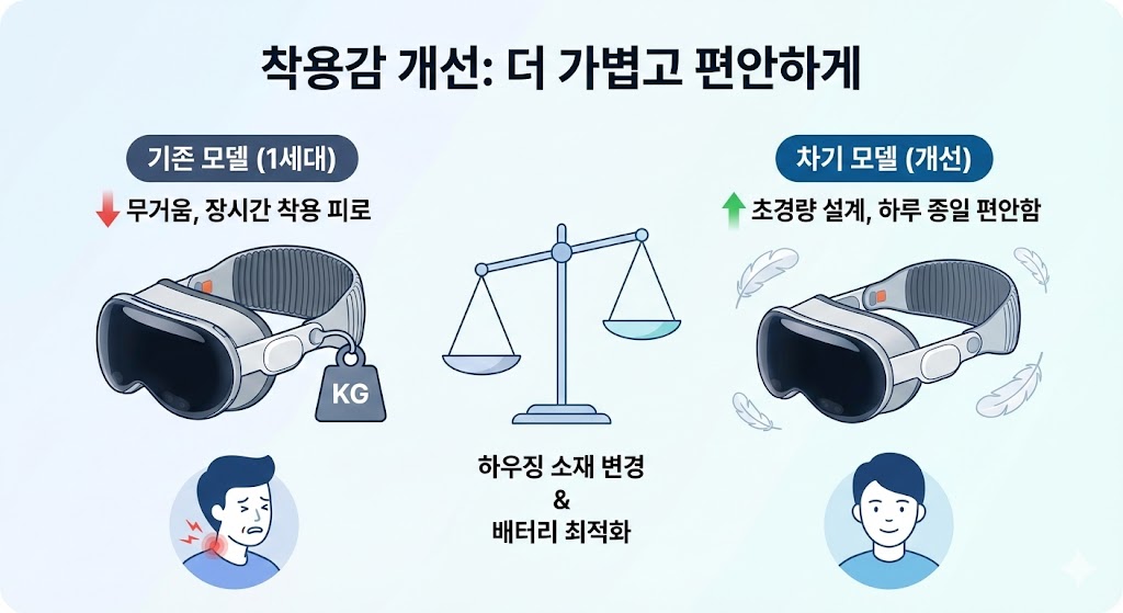 1세대의 가장 큰 단점으로 지적되었던 것이 바로 **'무게'**였죠. 애플은 차기작에서 하우징 설계 변경과 배터리 시스템 최적화를 통해 장시간 착용 시 피로도를 대폭 줄이는 데 사활을 걸고 있다고 합니다.