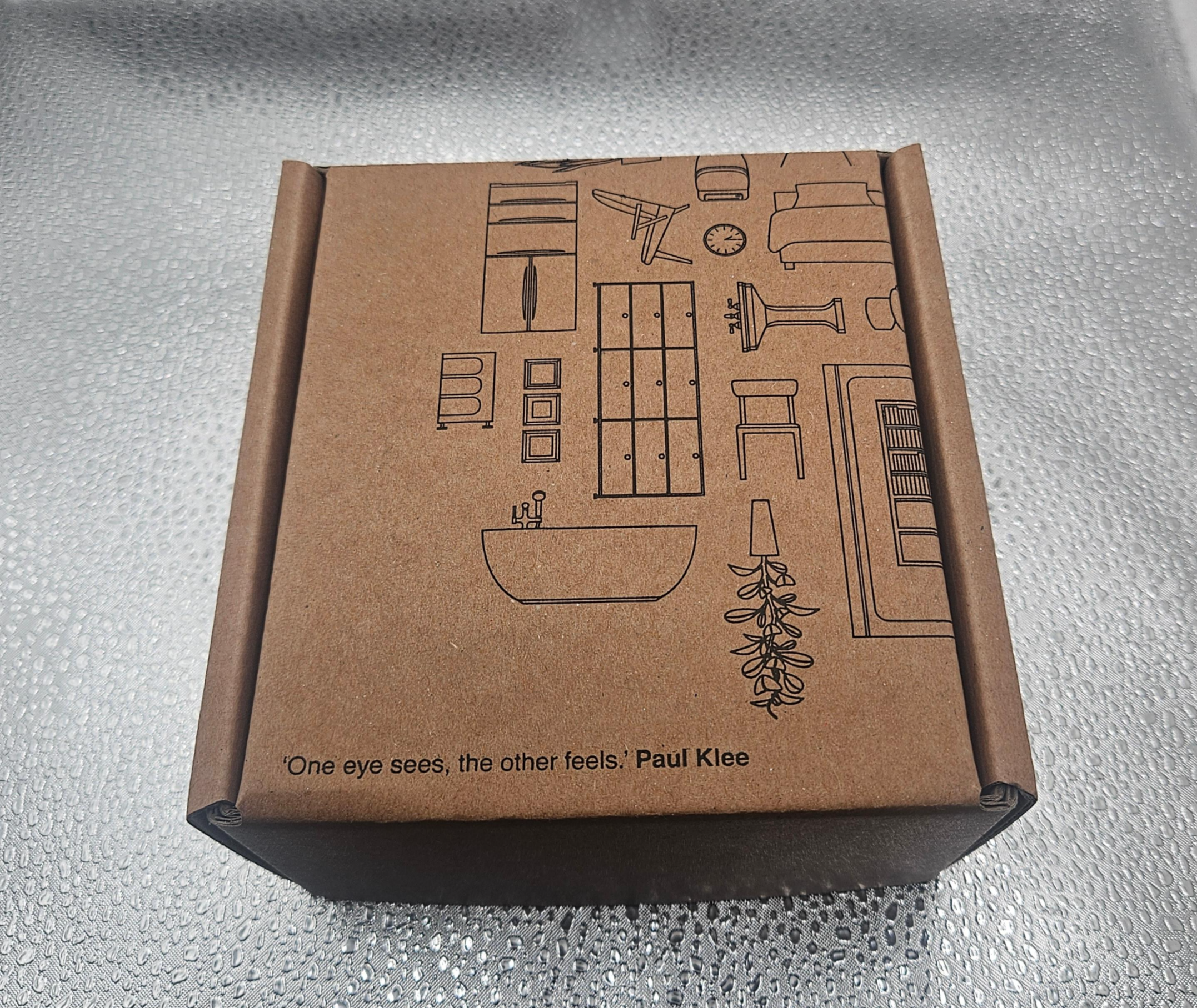택배 박스를 열자마자 보이는 **"One eye sees, the other feels. - Paul Klee"**라는