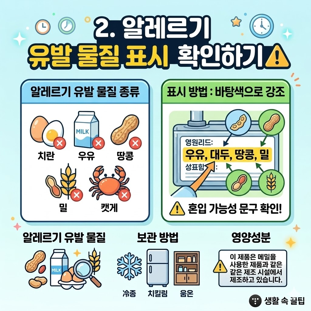 - 주의사항: "이 제품은 메밀을 사용한 제품과 같은 제조 시설에서 제조하고 있습니다"와 같은 혼입 가능성 문구도 꼼꼼히 체크하세요.