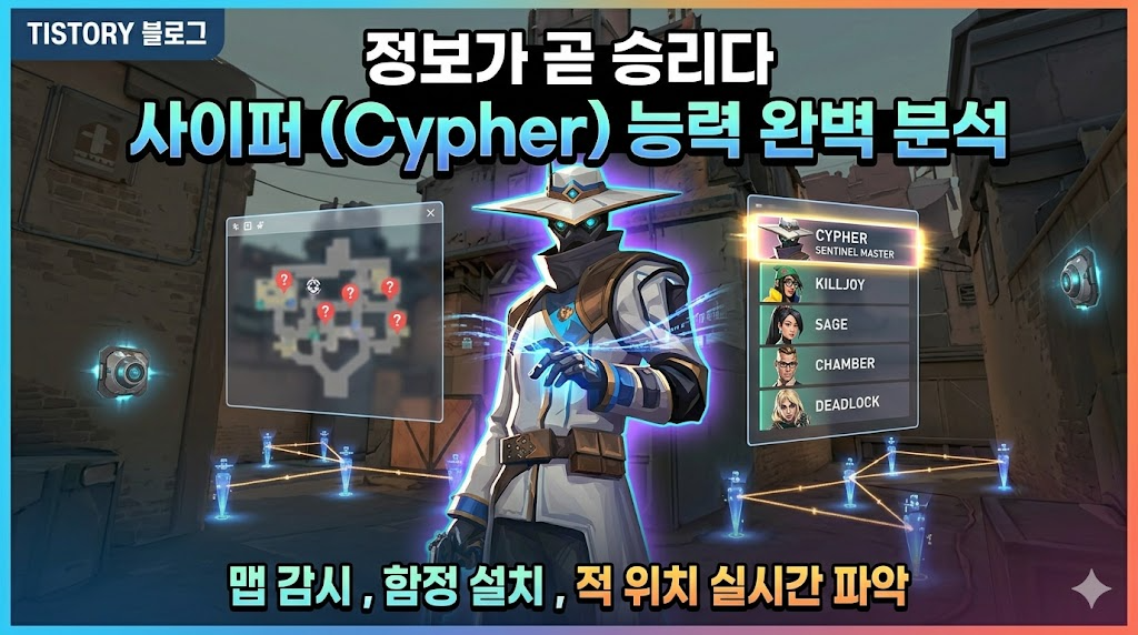 사이퍼는 맵 전체를 감시하는 **'정보전의 달인'**입니다.