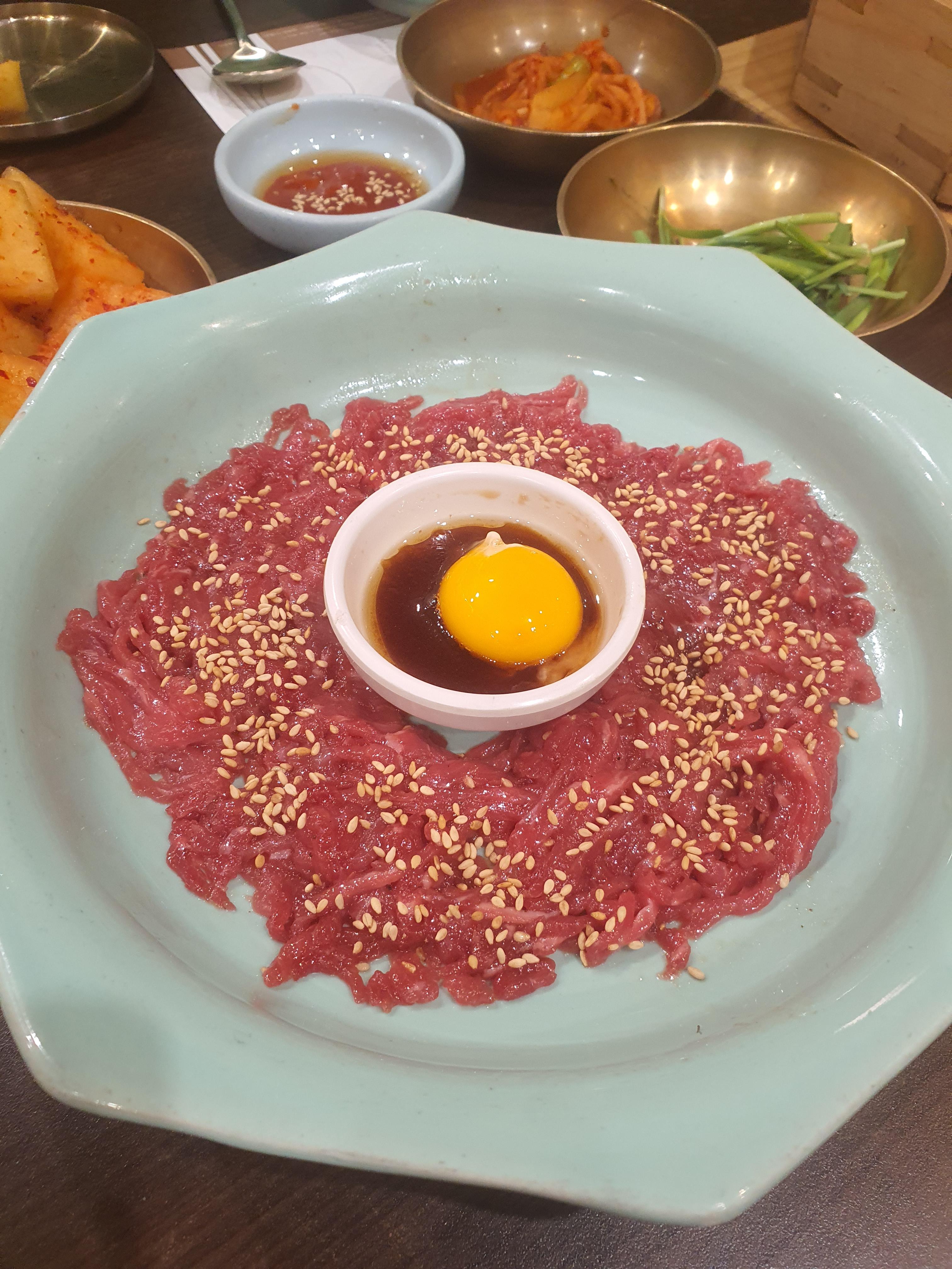 육회도 생각했던 것보다 많이 나와서 놀라고, 소스도 독특해서 두 번 놀라고, 입에서 살살 녹았습니다.