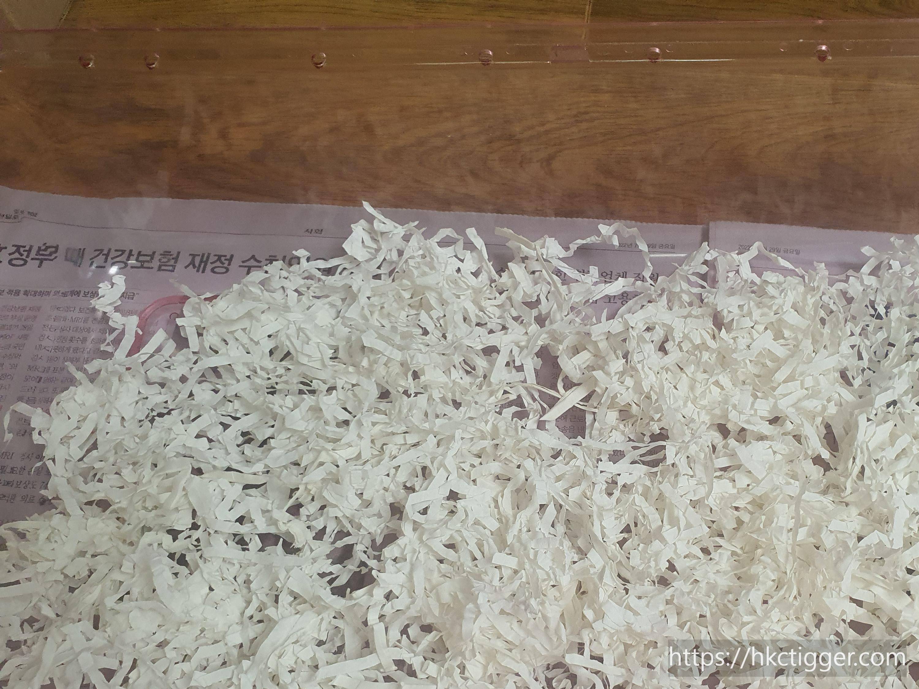 바닥에는 사탕수수 소재의 종이 느낌의 바닥재와 나무의 톱밥을 함께 두 가지를 깝니다.