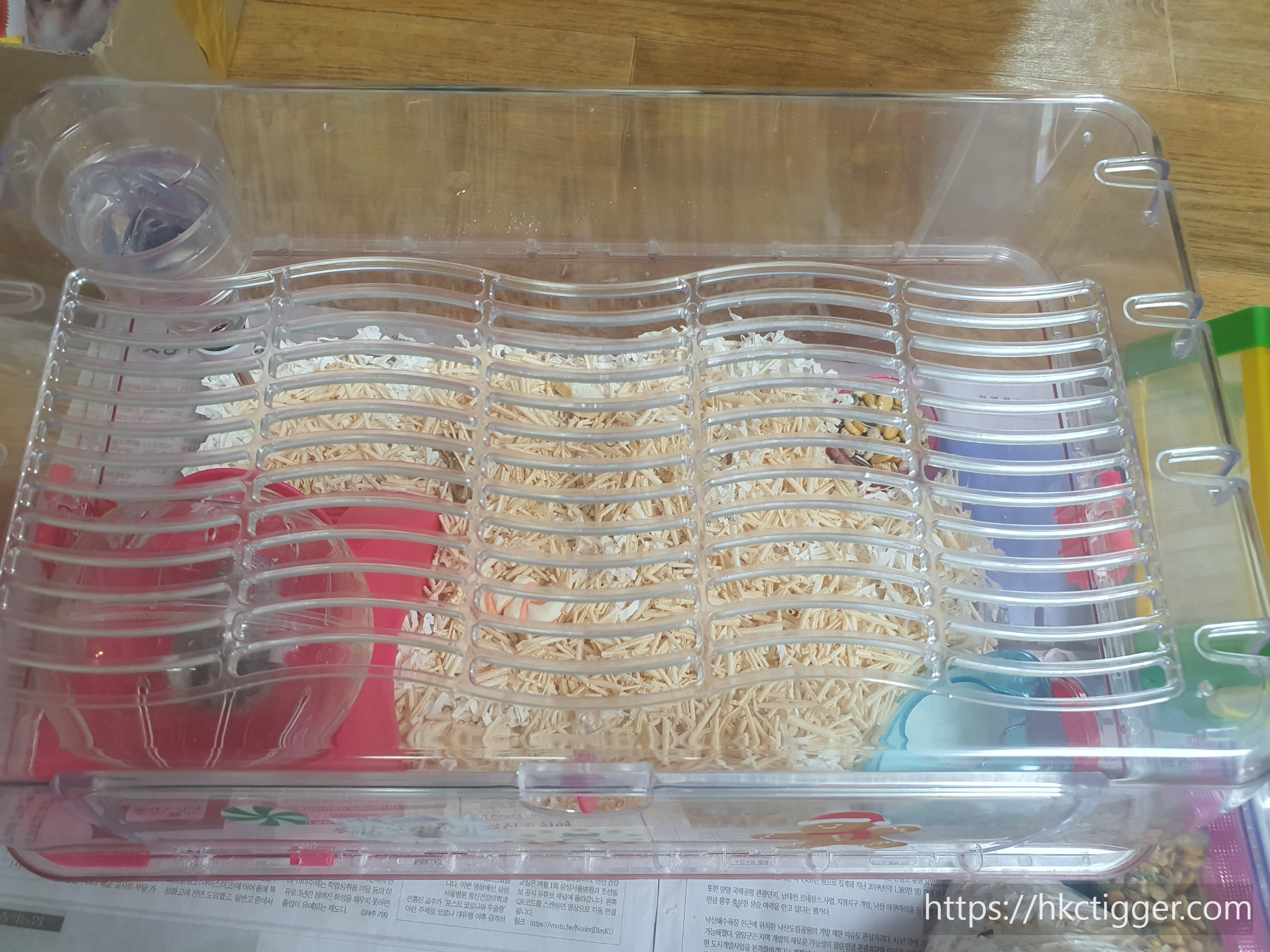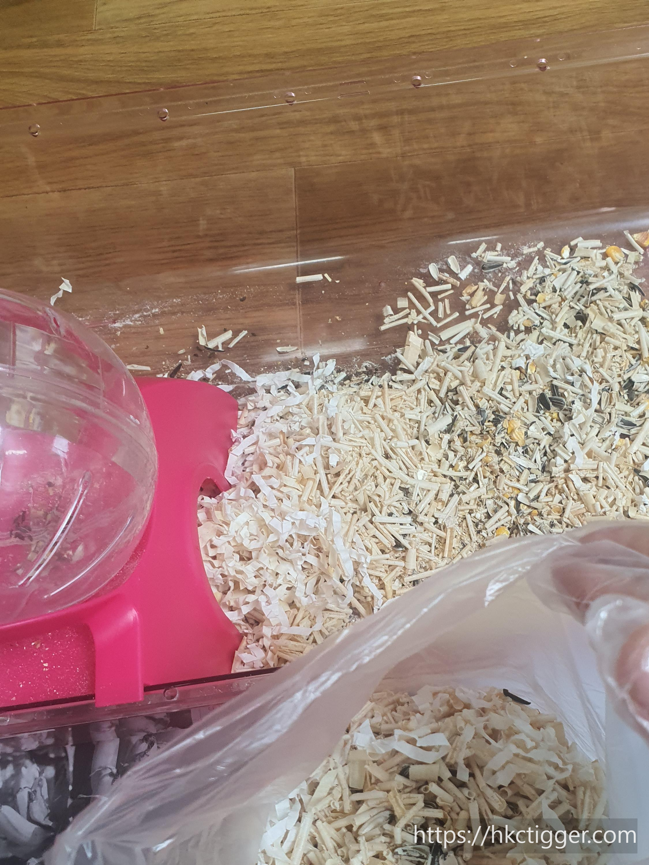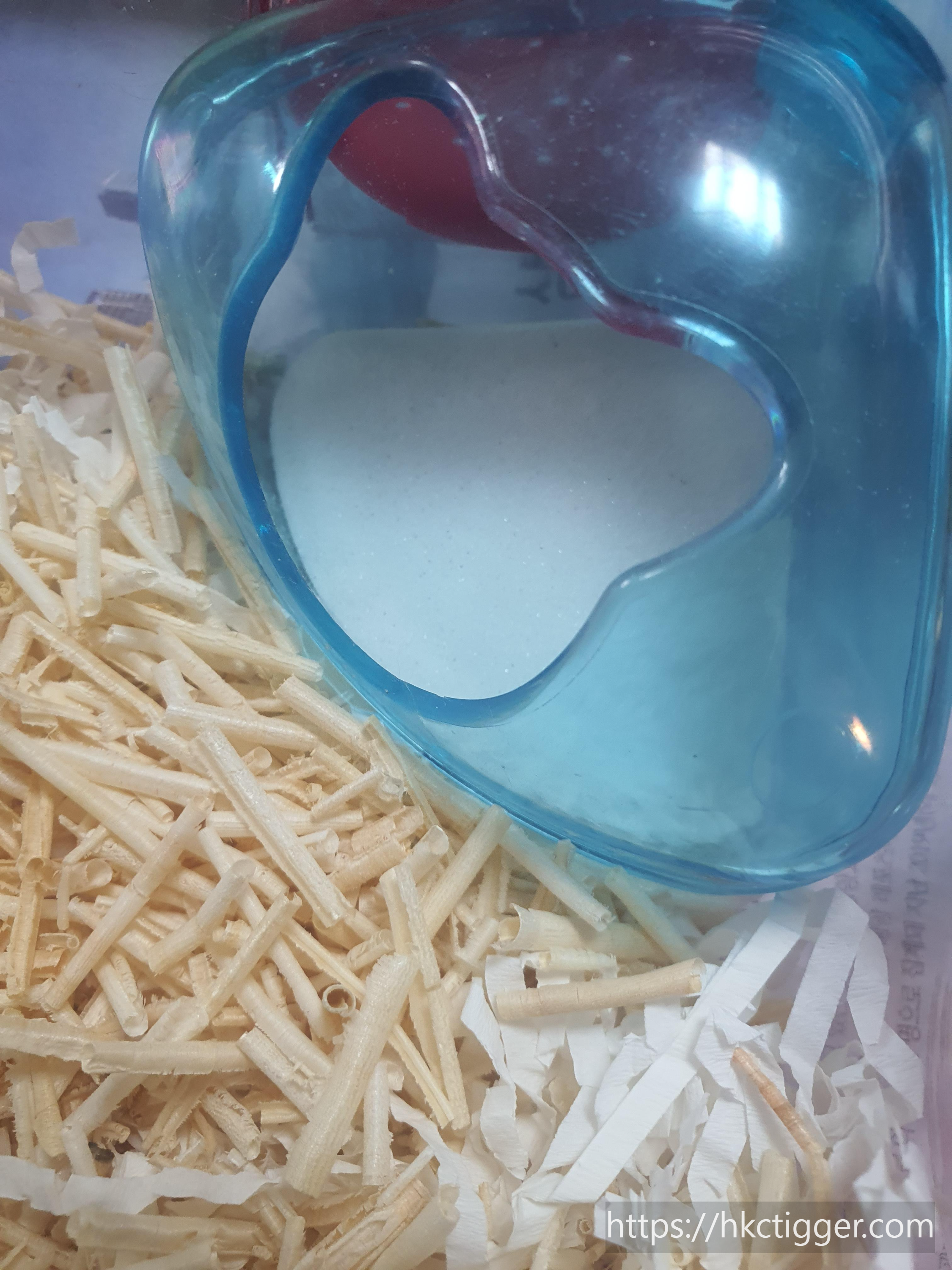 집 내부의 모래 목욕탕과 먹이통을 옮겨주고 바닥에 깔려있던 바닥재들을 비닐에 버립니다.
