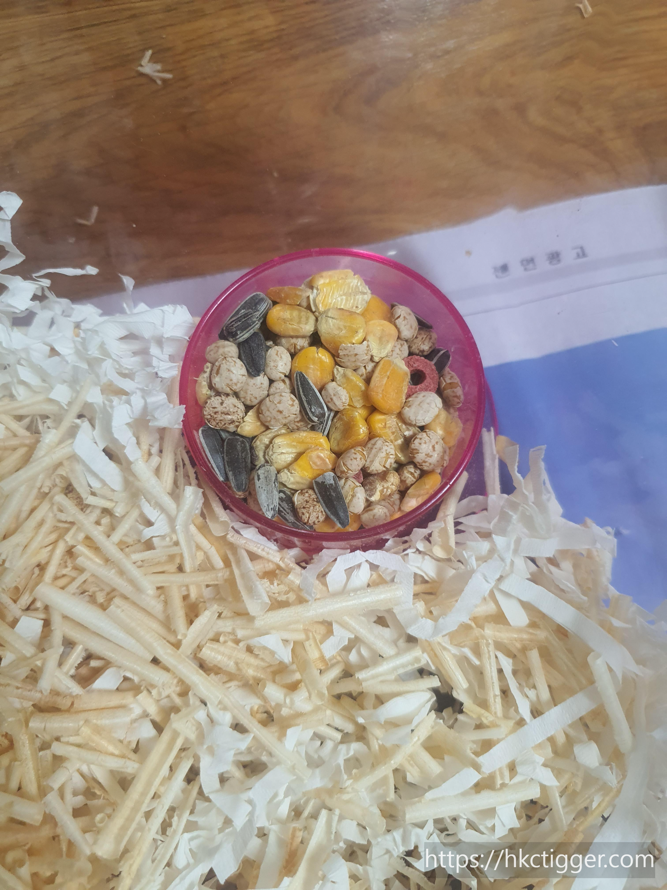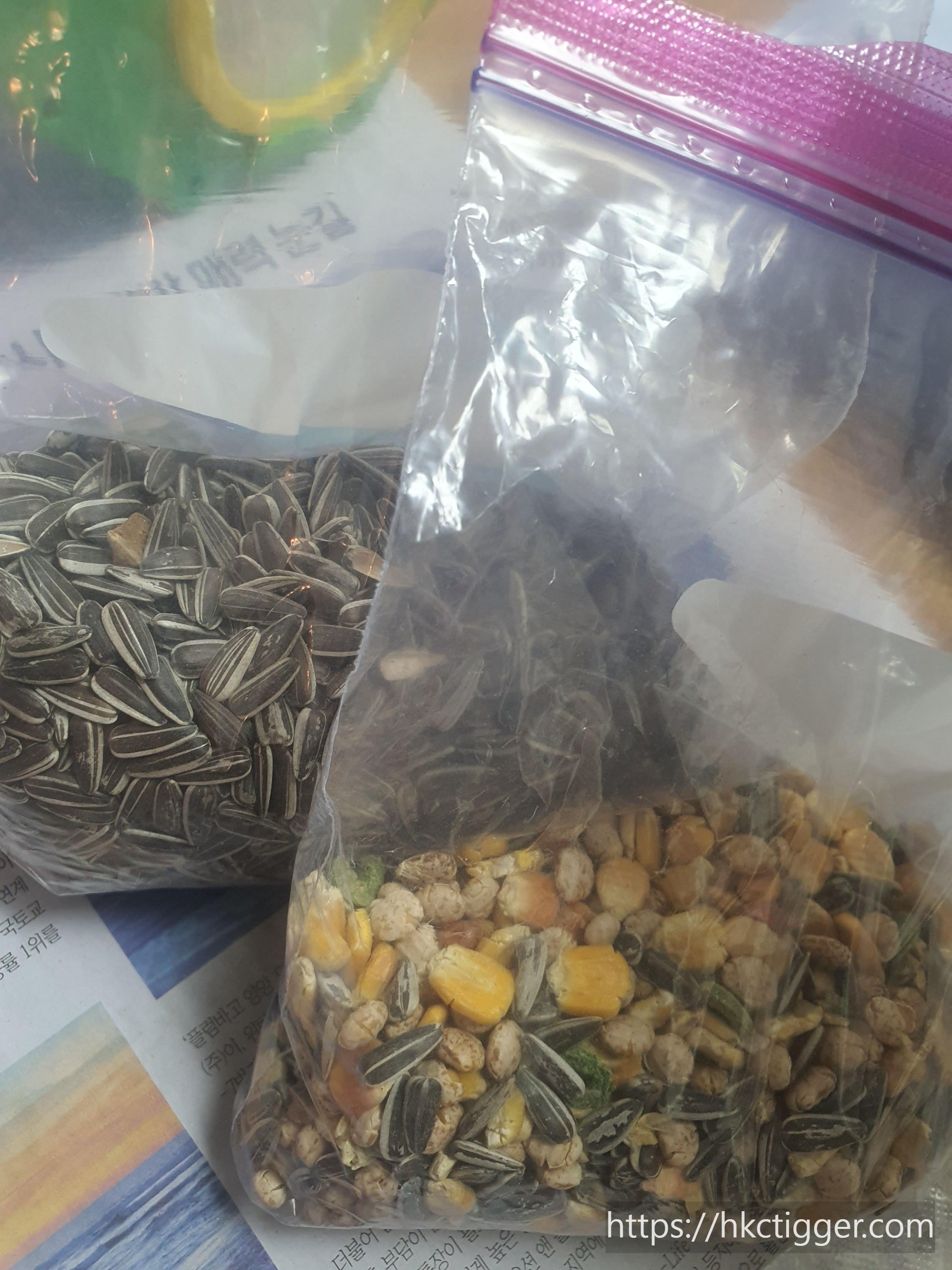 먹이는 두 가지 스타일을 먹이는데 해바라기씨앗과 옥수수 그리고 각각의 곡물로 만든 먹이입니다.