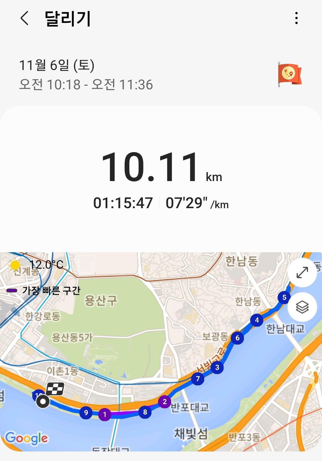 한강시민공원 이촌에서 한남 방면으로 뛰었다가 다시 돌아오는 코스였고요!