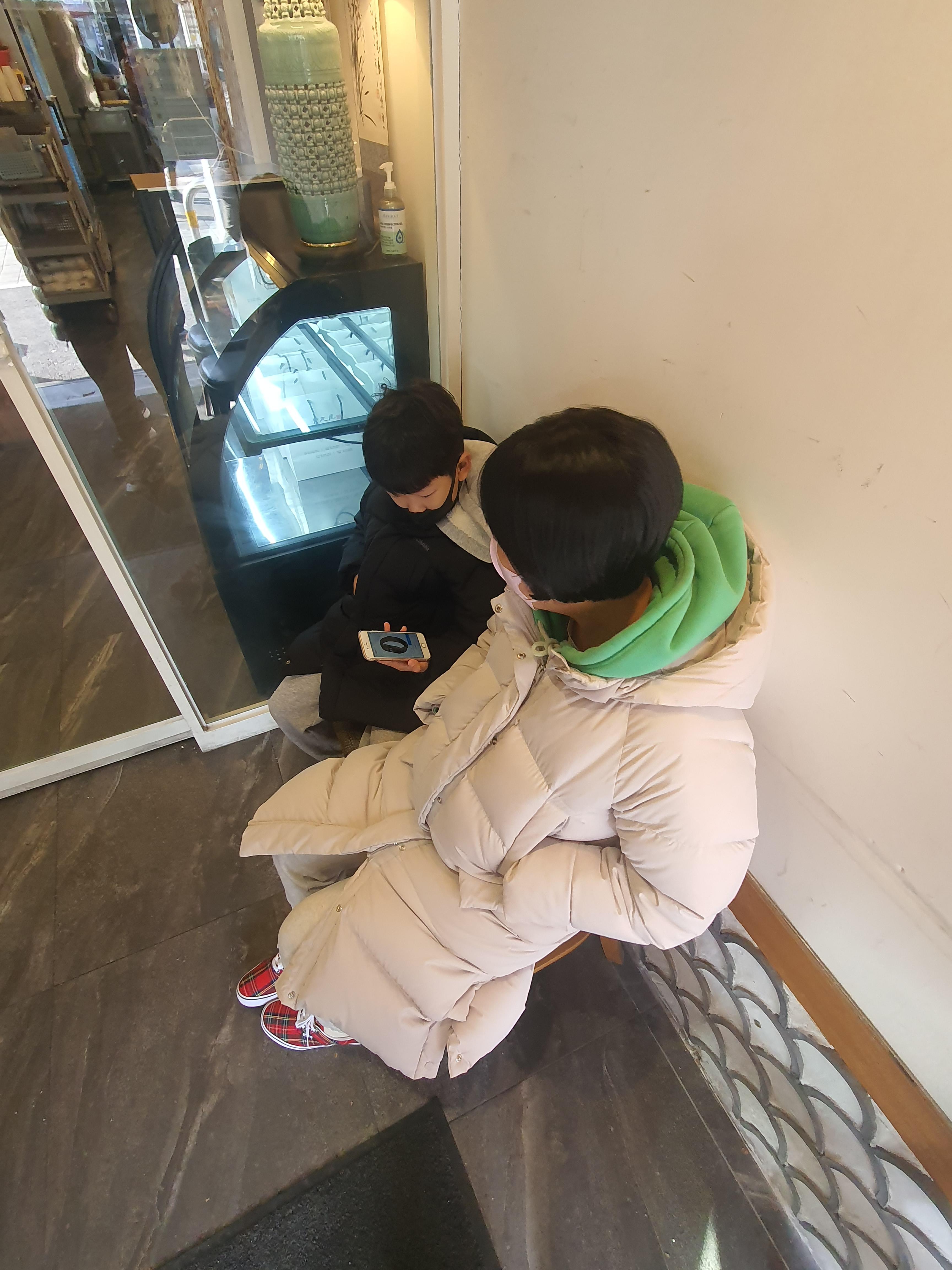 이모님께서 불러 주시기를 문 앞에 앉아 기다려 봅니다.